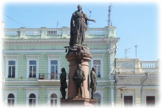 Добавим, что памятник императрице, действительно, оригинальное произведение искусства. На пьедестале возвышается величественная фигура Екатерины II. У подножия расположено ее знамя, взятое русскими войсками у врагов. В правой руке императрица держит высочайший рескрипт графу П.А. Зубову со словами: «Повелеваем быть порту и городу», а левой рукой показывает точку основания города.