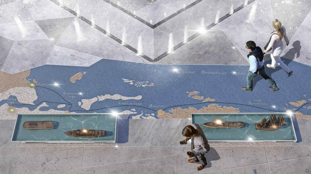 Архитектурное решение включает тематические элементы: фигуры кораблей, карту Северного морского пути и специальные декоративные элементы, оформленные в морской стилистике.